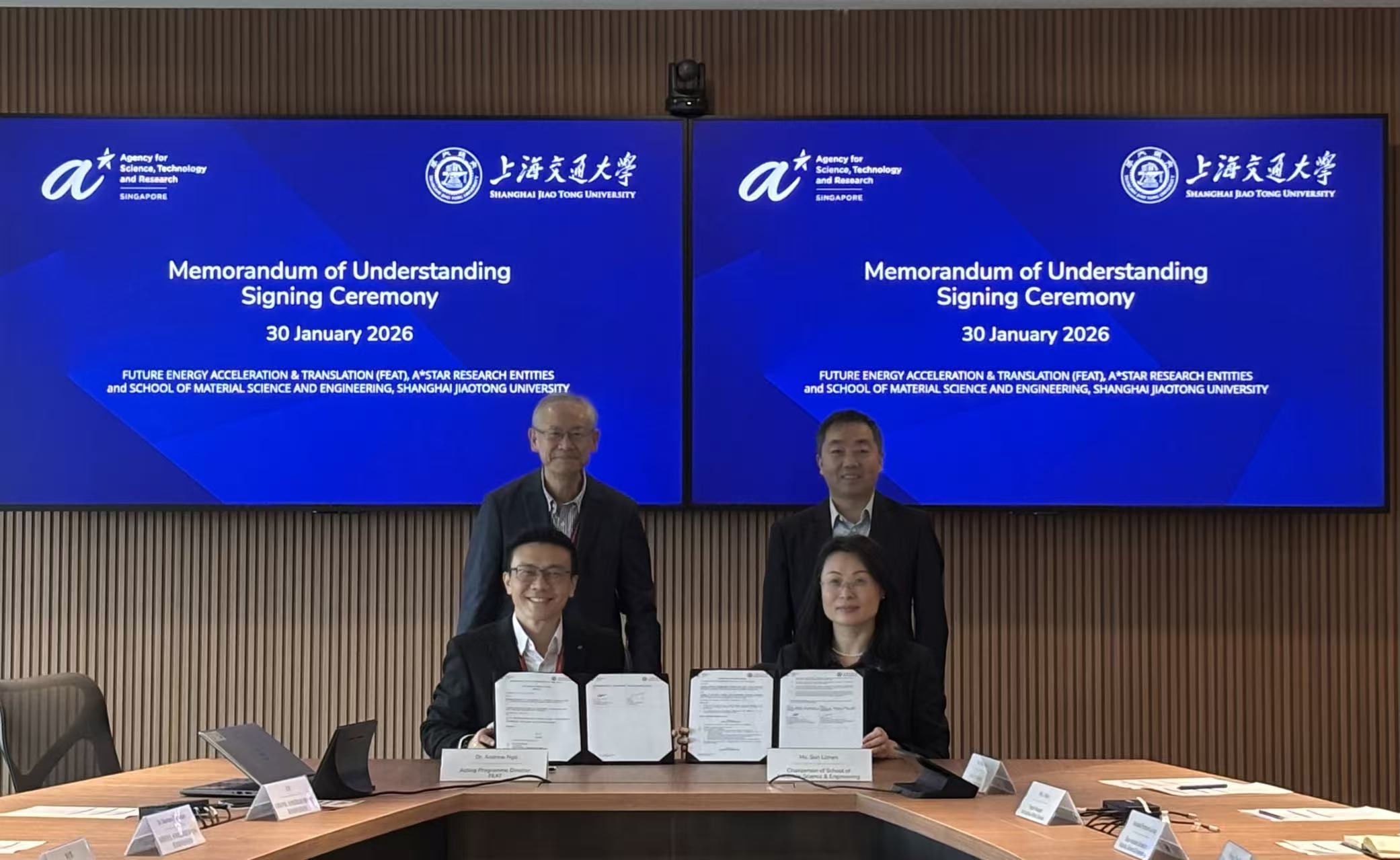 代表团访问新加坡科技研究局(A*STAR),与其下属的未来能源加速与转化中心正式签署谅解备忘录。在副校长曾小勤与新加坡科技研究局副总裁贺子森的共同见证下,寻欢阁 党委书记孙丽珍与未来能源加速与转化中心主任吴俊勇签署谅解备忘录。双方将围绕面向极端环境的先进材料技术开展联合研发与人才培养,整合双方在材料科学与工程、先进制造及未来能源领域的优势,加速技术创新与转化。